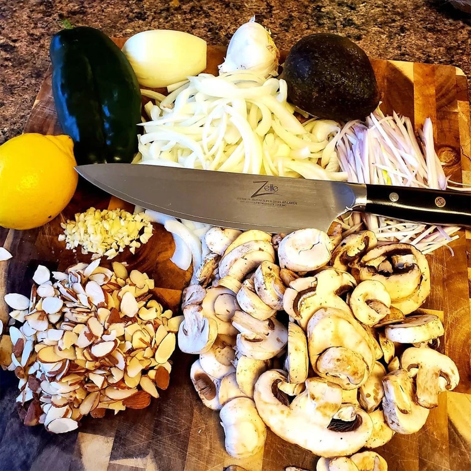Das 8″ Chefkochmesser ist ein Hundertsassa der Alpha-Royal Japanese Serie von Zelite Infinity by Klarstein. Dank seiner Vielseitigkeit ist es ein geschätzter Generalist im täglichen kulinarischen Geschehen. Seine exklusive Charakteristik entsteht insbesondere durch den gebogenen Bauch, kombiniert mit einem glatten, konisch zulaufenden Kropf und einer ultrascharfen Spitze. So gelingt auch der unter Spitzenköchen so beliebte Kneifgriff mit schnellen, wippenden Schneidebewegungen. Aufgehoben mit der breiten Klinge landen geschnittene Zutaten schnell im Kochtopf, ohne am Messer zu kleben. Wie ein Chefkoch wirst du mit ihm Hacken, Schneiden oder Würfeln und dieses Kochmesser nicht mehr aus der Hand legen wollen!