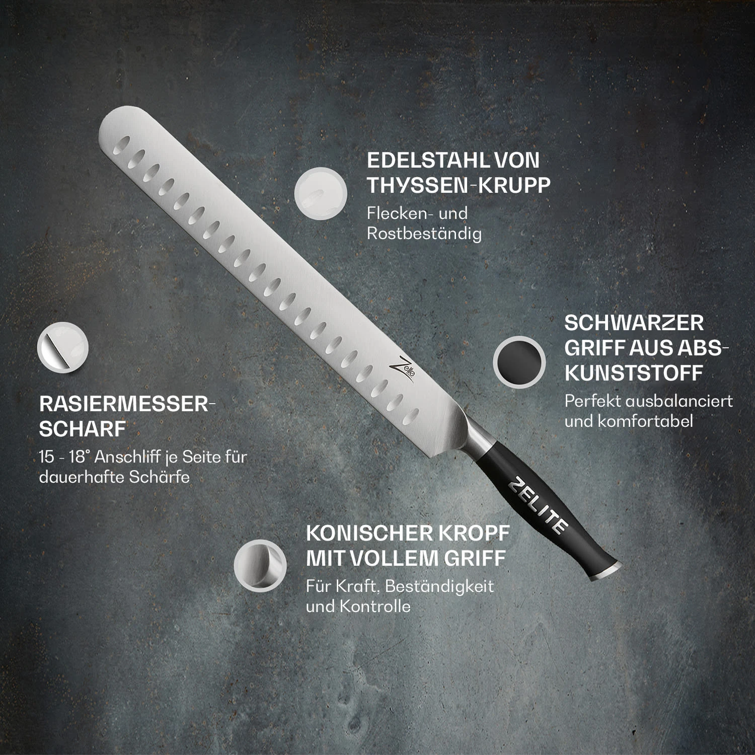 Das Zelite Infinity by Klarstein Comfort Pro 12″ Aufschnittmesser macht es dir ganz einfach, in einem Schnitt selbst durch große Fleischstücke zu gleiten und so wunderbar gleichförmige Scheiben zu erhalten. Der Hohlkammerschliff hilft dabei zusätzlich, indem er ein Ankleben und Mitreißen des Schneidguts verhindert. Ergänze deine Küchenmesser oder nutze es als perfektes Geschenk für kochende Freunde.