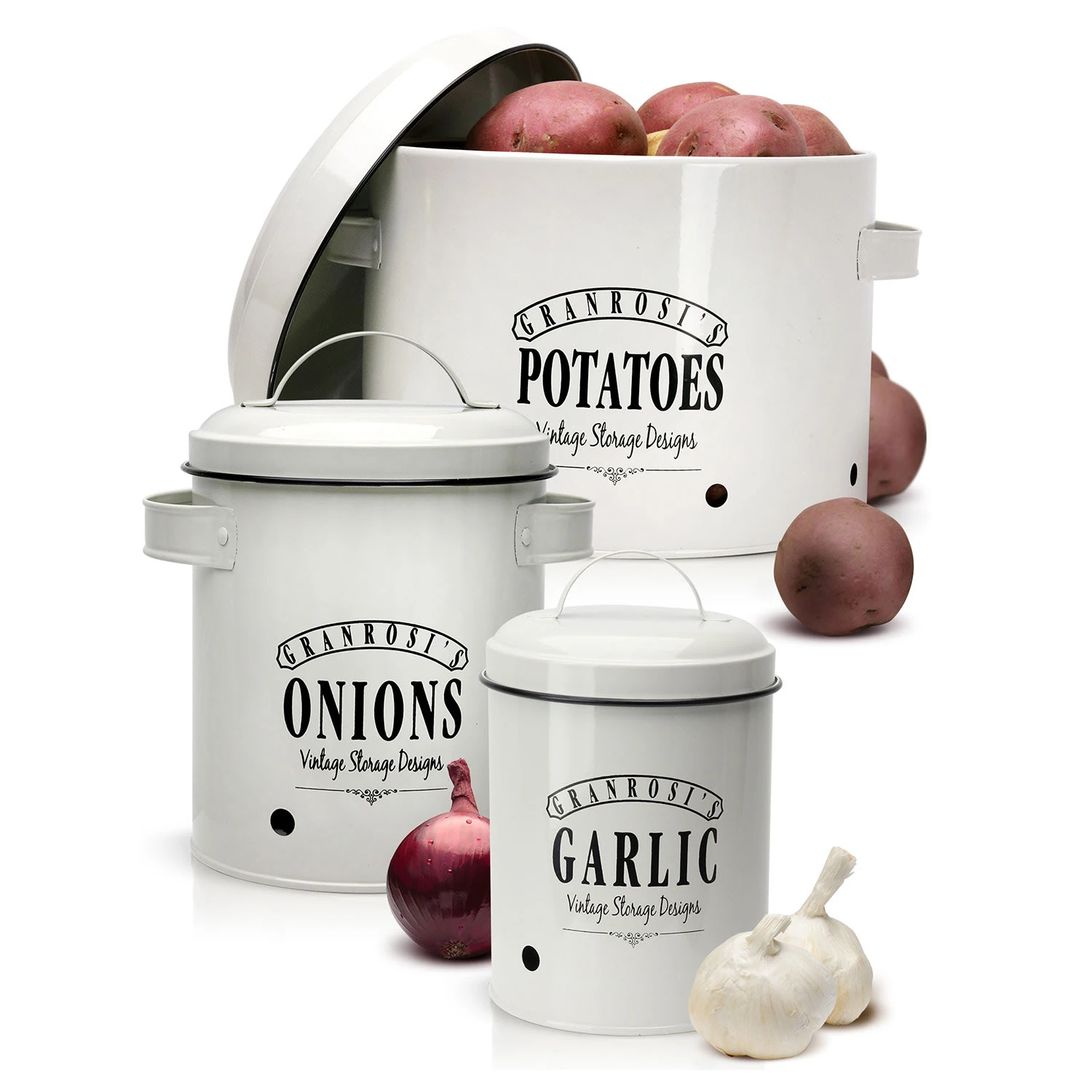 Die Georgia Vintage-Vorratsbehälter verleihen deiner Küche das gewisse Etwas und sind eine Bereicherung für jeden Haushalt: Bestehend aus insgesamt 3 x Klarstein Vorratsdosen für Knoblauch (12 x 18 cm (ØxH)), Zwiebeln (17 x 22,5 x 14 cm (BxHxT)) und Kartoffeln (27 x 21 x 23,5 cm (BxHxT)).