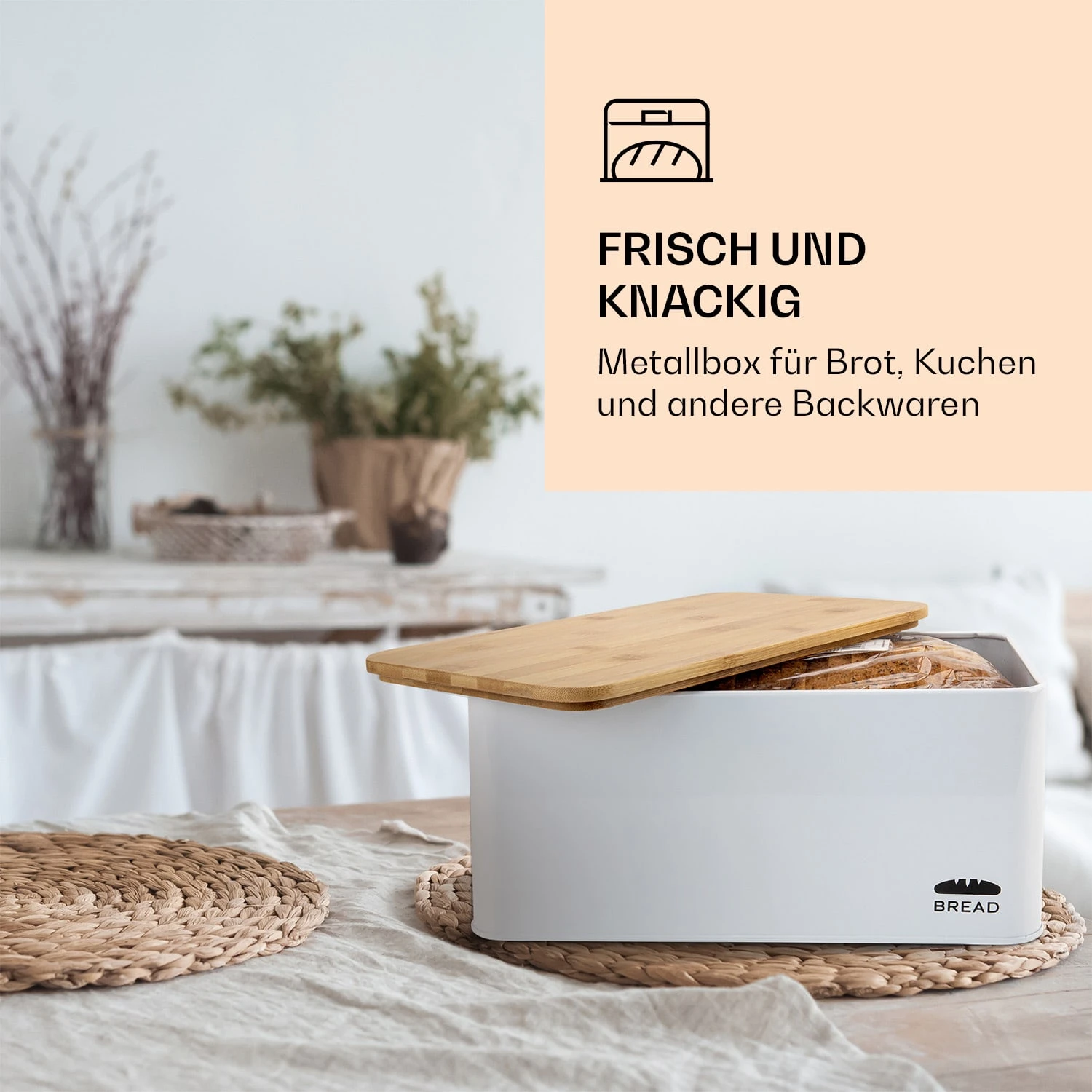 Praktisch und schick! Die große Metall-Brotbox Oklahoma mit Schneidebrett im trendigen Look von Klarstein ist nicht nur sehr stabil und groß genug für die gleichzeitige Lagerung von mehreren Broten und Backwaren, sondern auch ein absoluter Hingucker in der Küche. Dank der Lüftungslöcher auf der hinteren Seite des Brotbehälters ist für die wichtige Luftzirkulation gesorgt. Das vermindert Feuchtigkeit im Inneren und hält dein Brot lange knusprig und frisch! Der praktische und robuste Deckel aus Bambus kann darüber hinaus auch als Schneidebrett verwendet werden. Mit Maßen von 35,5 x 15,5 x 23 cm (BxHxT) passt dieser Brotspeicher bequem auf dein Sideboard, deine Küchenzeile oder in den geräumigen Küchenschrank.