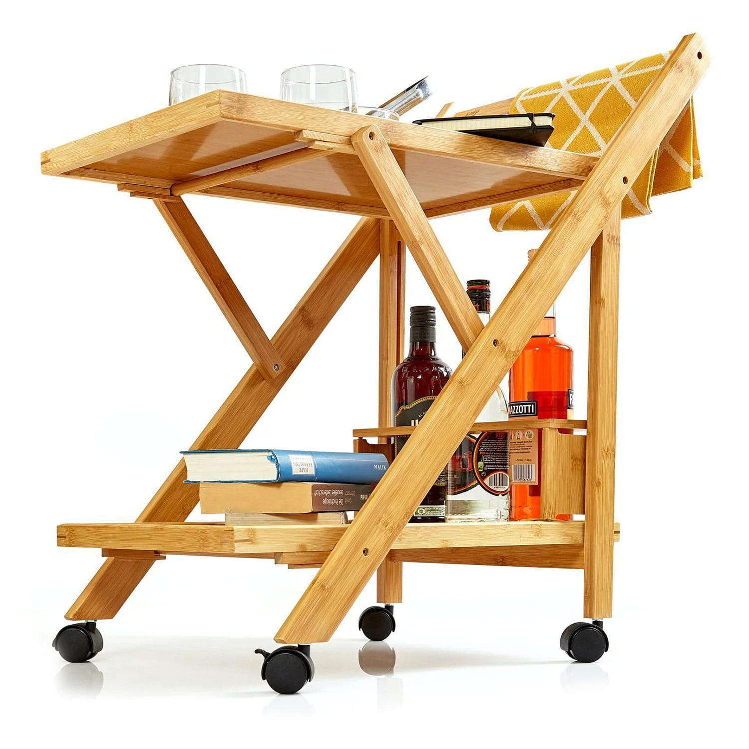 Der praktische blumfeldt Servierwagen ist ein schickes Multitalent bei dir zu Hause. Der zweietagige Trolley lässt sich dank 4 Bodenrollen sehr einfach bewegen und bleibt durch seine Feststellbremen sicher an Ort und Stelle. Dank der eingebauten Bremsen kannst du ihn auch ideal als festetabliertes Möbelstück nutzen. Der Küchenwagen ist komplett aus Bambus gefertigt. Bambus ist von Natur aus feuchtigkeitsbeständig, damit sind den Einsatzmöglichkeiten kaum Grenzen gesetzt: Ob als mobiles Küchenregal, Badwagen oder Beistelltisch für Snacks und Getränke beim Fernsehabend. Ein besonderes Highlight ist der Flaschenhalter auf der unteren Etage. Du kannst die beiden Ablageflächen mit bis zu 8 kg belasten. Wenn der Allzweckwagen einmal nicht im Einsatz ist, kannst du ihn mit wenigen Handgriffen platzsparend zusammenklappen.
