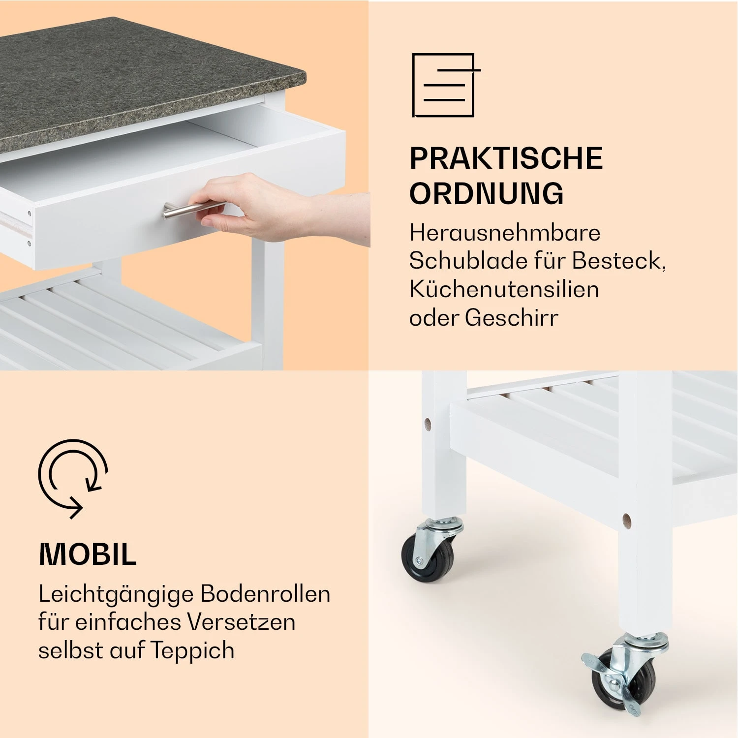 Edel und hochwertig: Der Klarstein Tennessee Küchenwagen ist dein luxuriöser und servierfreudiger Küchenhelfer aus lasiertem Holz mit einem Top aus Granit.