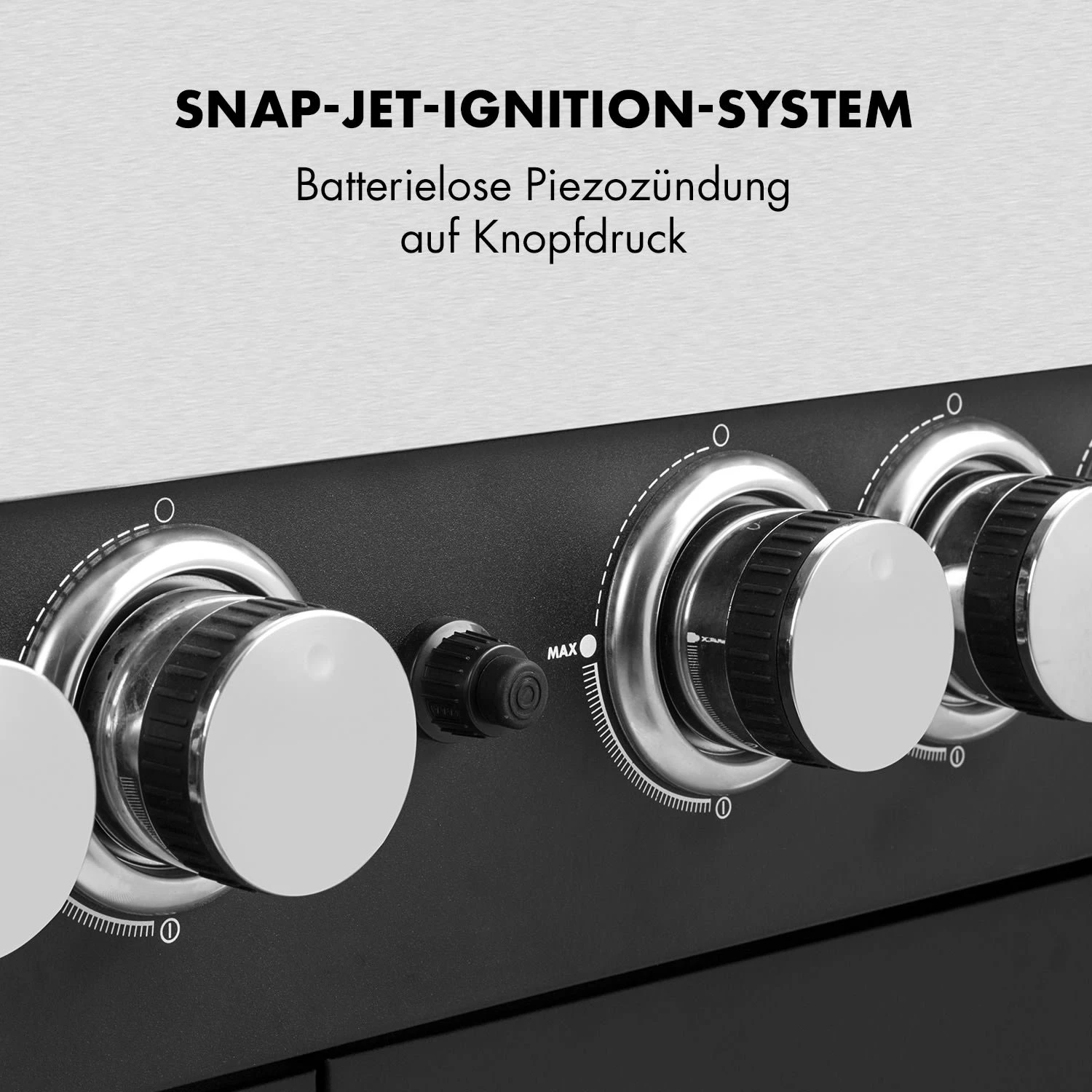 Schluss mit lästigem Kohlenstaub und aufwendigem Anzünden: dank SNAP-JET-Ignition-System mit integrierter Piezozündung können die 6 Brenner bequem und augenblicklich per Knopfdruck gestartet werden. Der Grill verfügt über das InstantReady Concept und ist durch den mitgelieferten Druckminderer und Gasschlauch sofort einsatzbereit. 4 Hauptbrenner sorgen mit jeweils 3,5 kW Heizleistung für Grillhitze unter dem gusseisernen Grillrost. An der Rückwand des Hitze-Wunders ist ein Infrarotbrenner (3,5 kW) angebracht, der unter einer Warmhalteschiene bereits gebratenes Grillgut zuverlässig mit Wärme versorgt. Integriert in den linken Seitentisch und versteckt unter einer pulverbeschichteten Stahl-Luke verbirgt sich der 3,2 kW starke Seitenbrenner, der bestens für die Zubereitung von Soßen und verschiedenen Beilagen in Töpfen oder Pfannen geeignet ist. Der zentrale Grillrost bietet sich mit seiner besonders großen Fläche von 64 x 42 cm für verschiedenste Grillkost an: herzhafte Steaks, knackige Würste, leckeres Grillgemüse oder saftiger Fisch. Die große Grillplatte aus emailliertem Gusseisen sorgt für eine gleichmäßige Verteilung der Hitze, sodass auch in Randlagen der Grillzone alles schön kross gebraten wird. Mit der großen, doppelwandigen Edelstahl-Haube sind auch Spezialitäten des passiven Grillens wie Pulled Pork oder Spare Ribs kein Problem. Besonders hervorzuheben ist das große, in die Grillhaube integrierte Sichtfenster aus Glas, durch das alle Köstlichkeiten und deren Grillgrade jederzeit und ohne Hitzeverlust im Blick behalten werden. Das integrierte Thermometer in der Mitte des Sichtfensters erleichtert dabei die Temperaturüberwachung. Ist der Grill zu heiß oder zu kalt, wird einfach an den stufenlosen Drehschaltern nachjustiert. Für viel Platz beim Grillen sorgen die beiden Seitentische aus Edelstahl mit einer Abstellfläche von jeweils 35 x 43,5 cm – genug für Schüsseln, Pfannen, Besteck, Getränke oder Gewürze. Haben wir an alles für Ihr perfektes Grillerlebnis gedacht? Na klar, denn der Tomahawk 4.2 SBG besitzt auch noch 3 Haken zum Aufhängen von Grillzange, Spießen oder Pfannenwendern sowie einen integrierten Flaschenöffner für die schnelle Erfrischung.
